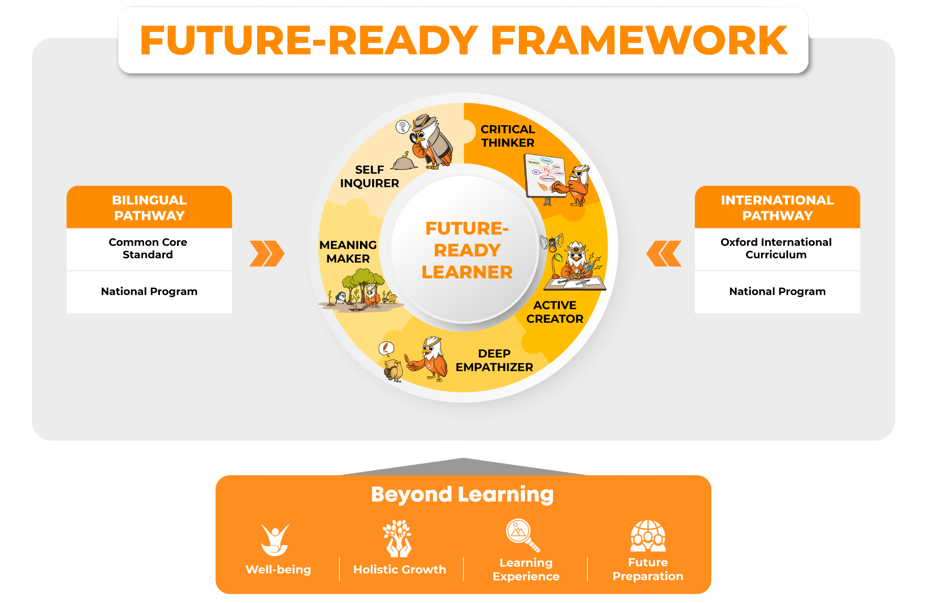 The Future-Ready Framework at UTS presents a comprehensive picture of how the school nurtures learners who are prepared for the future through two flexible learning pathways and the Beyond Learning educational approach. This framework enables students to explore, acquire, analyze, and apply integrated knowledge across multiple disciplines while developing critical thinking, the ability to evaluate issues from multiple perspectives, and maintaining a healthy balance between physical, intellectual, and emotional well-being.