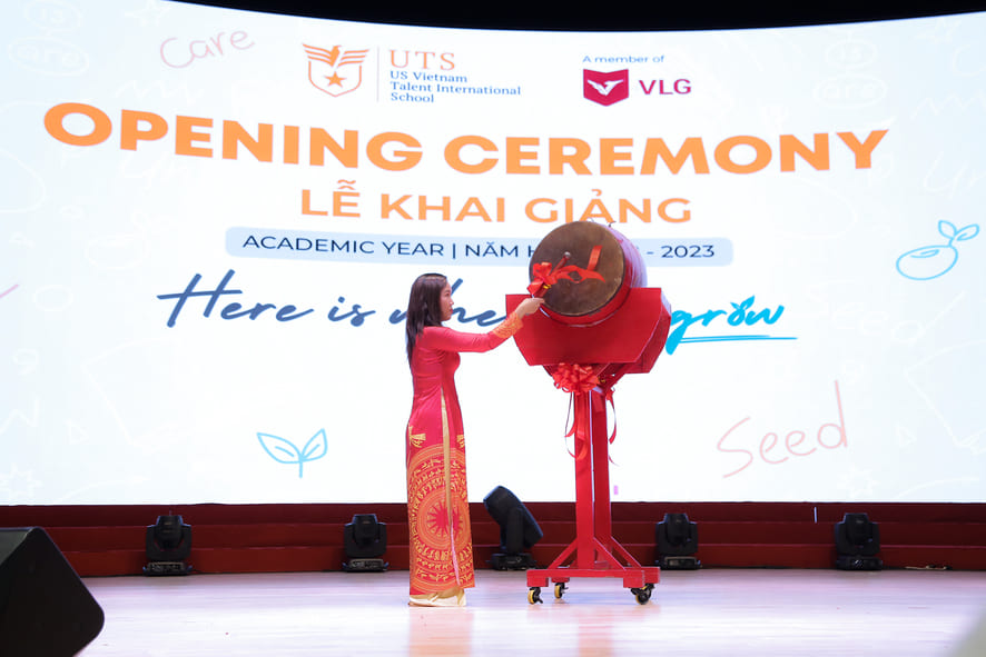Trong ngày lễ Khai giảng vô cùng ý nghĩa với học sinh thì không thể nào thiếu nghi thức đánh trống khai trường. Cô Nguyễn Thị Ngọc Lan – Hiệu trưởng trường UTS, đã đánh những hồi trống đánh dấu cho một khởi đầu mới đầy hứa hẹn.